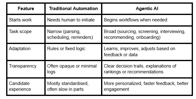 Traditional automation tools help with parts of the hiring process. They may parse resumes, send auto-emails or help with scheduling. But they are mostly reactive. They wait for humans to trigger them.